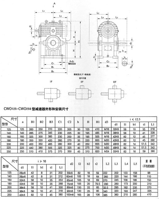 CWO蝸輪減速機,符合待業推薦性標準JB/T7935-95(原國標 GB9147-88),此標準達到國際九十年代水平。全系列共包括三種型號,16種中心距,12種速比。輸入功率范圍在0.39~189KW之間,輸出扭矩在107~13500N·m之間。 圓弧圓柱蝸桿軸可正、反兩個方向運轉,輸入轉速不超過1500r/min,工作環境溫度為-40~40℃時,必須采取冷卻措施。