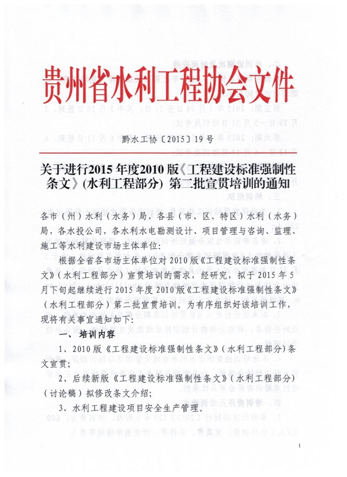 關(guān)于進(jìn)行2015年度2010版《工程建設(shè)標(biāo)準(zhǔn)強(qiáng)制性條文》(水利工程部分)第二批宣貫培訓(xùn)班的通知