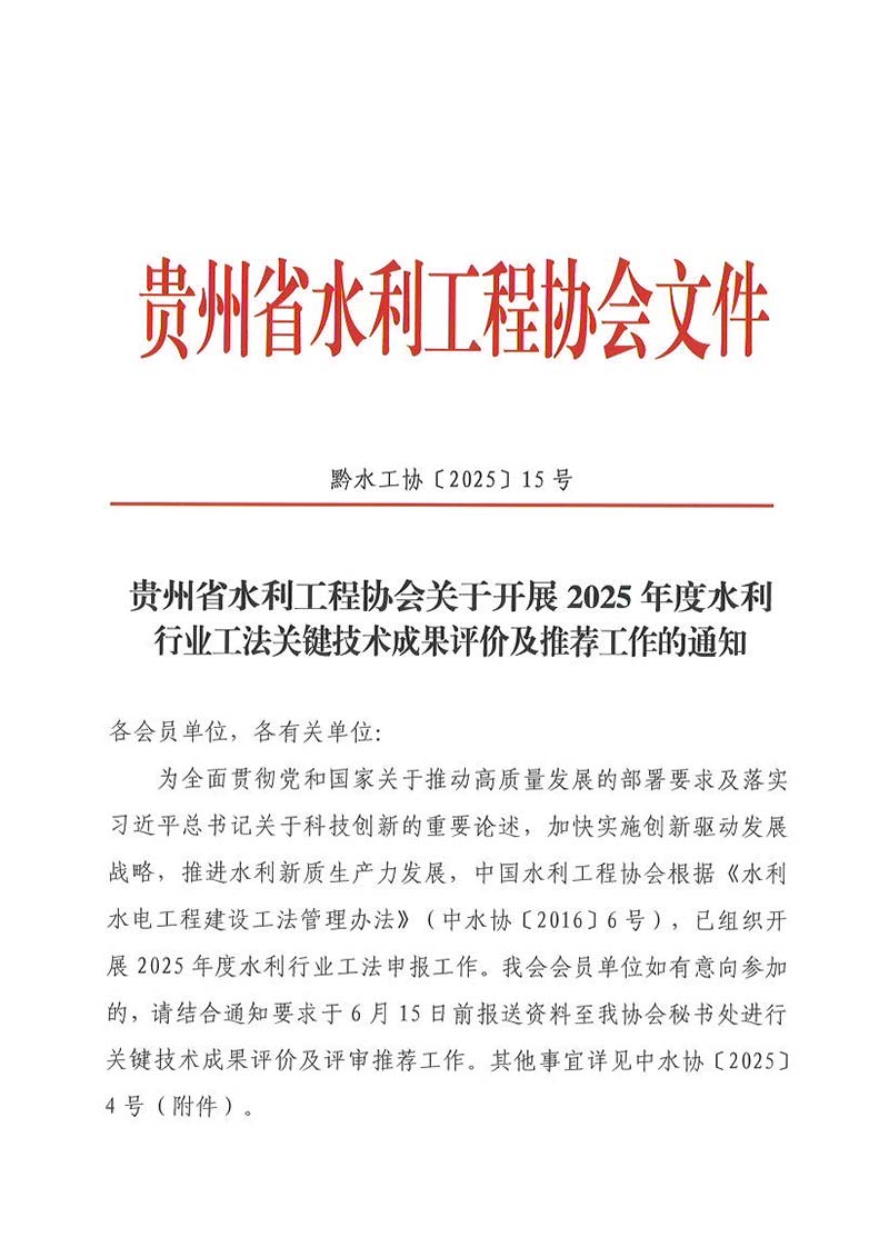 關于開展2025年度水利行業(yè)工法關鍵技術成果評價及推薦工作的通知