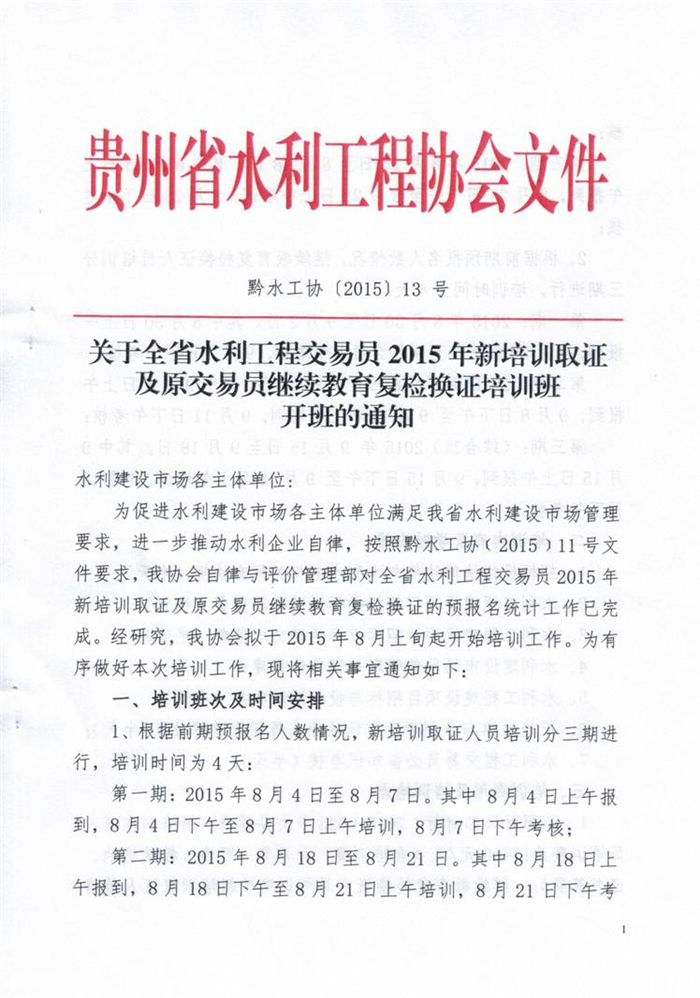 關(guān)于全省水利工程交易員2015年新培訓取證及原交易員繼續(xù)教育復檢換證培訓班開班的通知