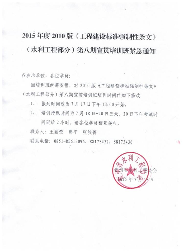 2015年度2010版《工程建設(shè)標(biāo)準(zhǔn)強(qiáng)制性條文》(水利工程部分)第八期宣貫培訓(xùn)班緊急通知