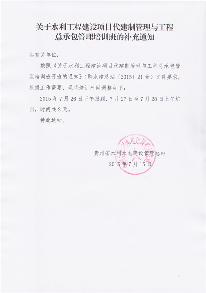 關(guān)于水利工程建設(shè)項(xiàng)目代建制管理與工程總承包管理培訓(xùn)班的補(bǔ)充通知