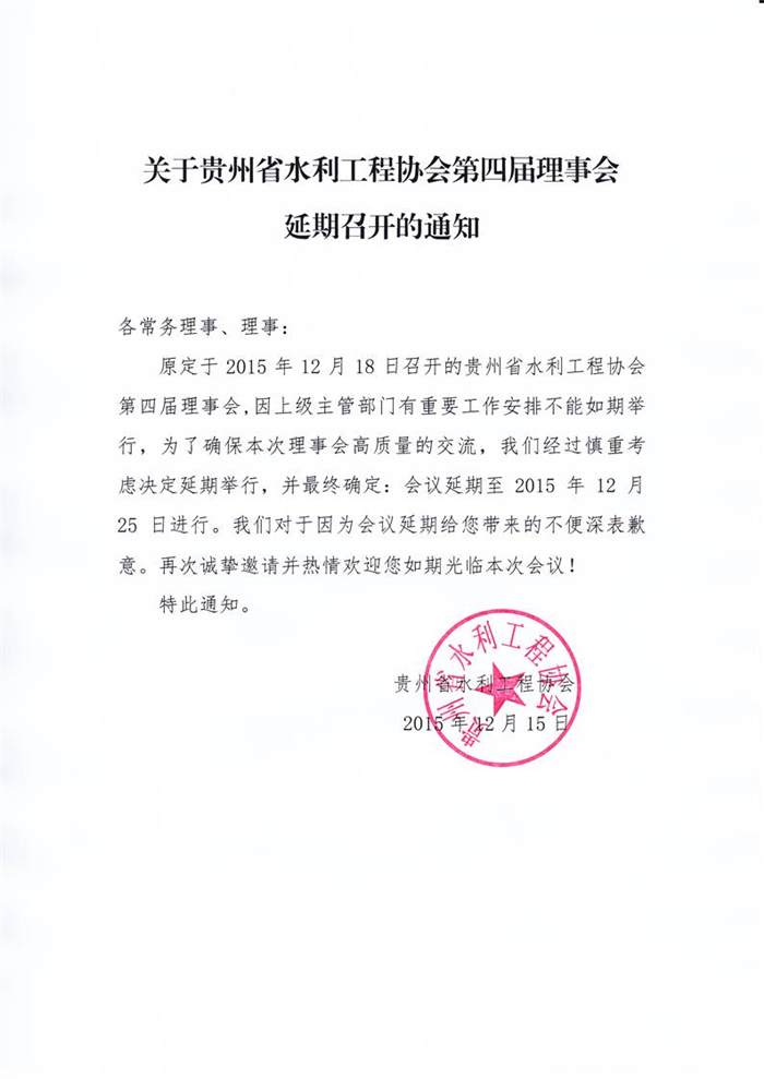 關(guān)于貴州省水利工程協(xié)會第四屆理事會延期召開的通知