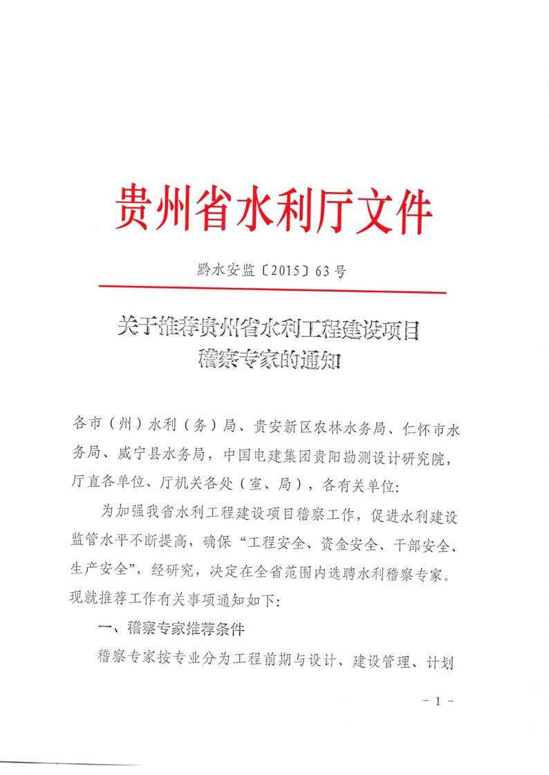 附件1:《關(guān)于推薦貴州省水利工程建設(shè)項(xiàng)目稽察專家的通知》(黔水安監(jiān)〔2015〕63號)