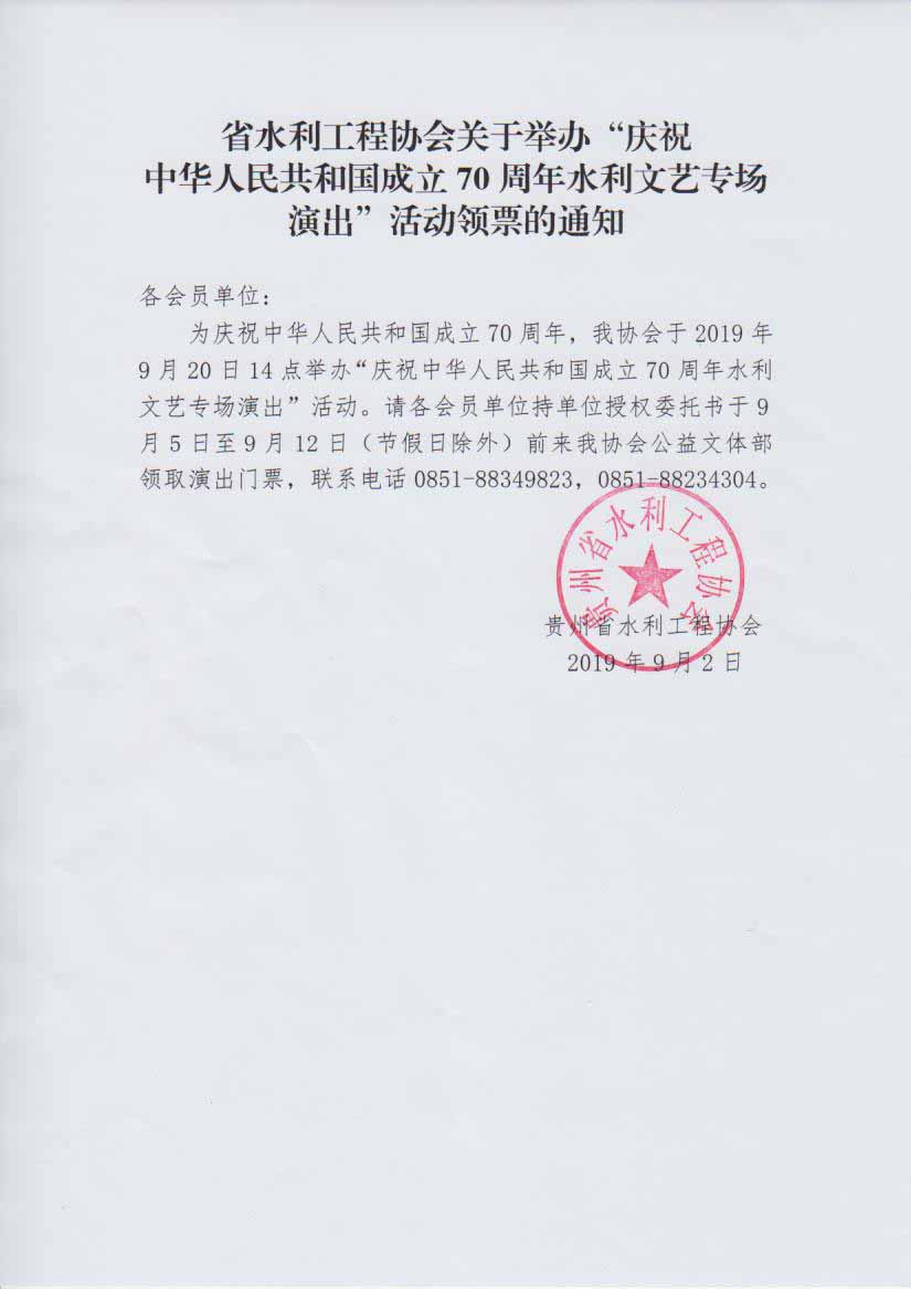 省水利工程協會關于舉辦“慶祝中華人民共和國成立70周年水利文化專場演出”活動領票的通知