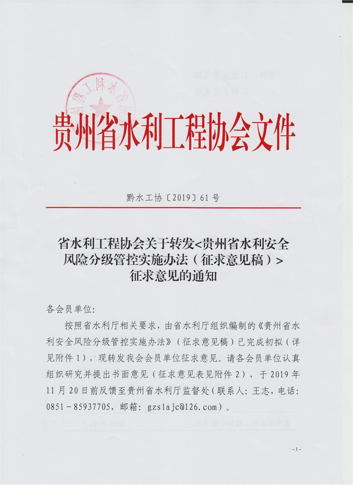 省水利工程協(xié)會(huì)關(guān)于轉(zhuǎn)發(fā)<貴州省水利安全風(fēng)險(xiǎn)分級(jí)管控實(shí)施辦法(征求意見稿)>征求意見的通知