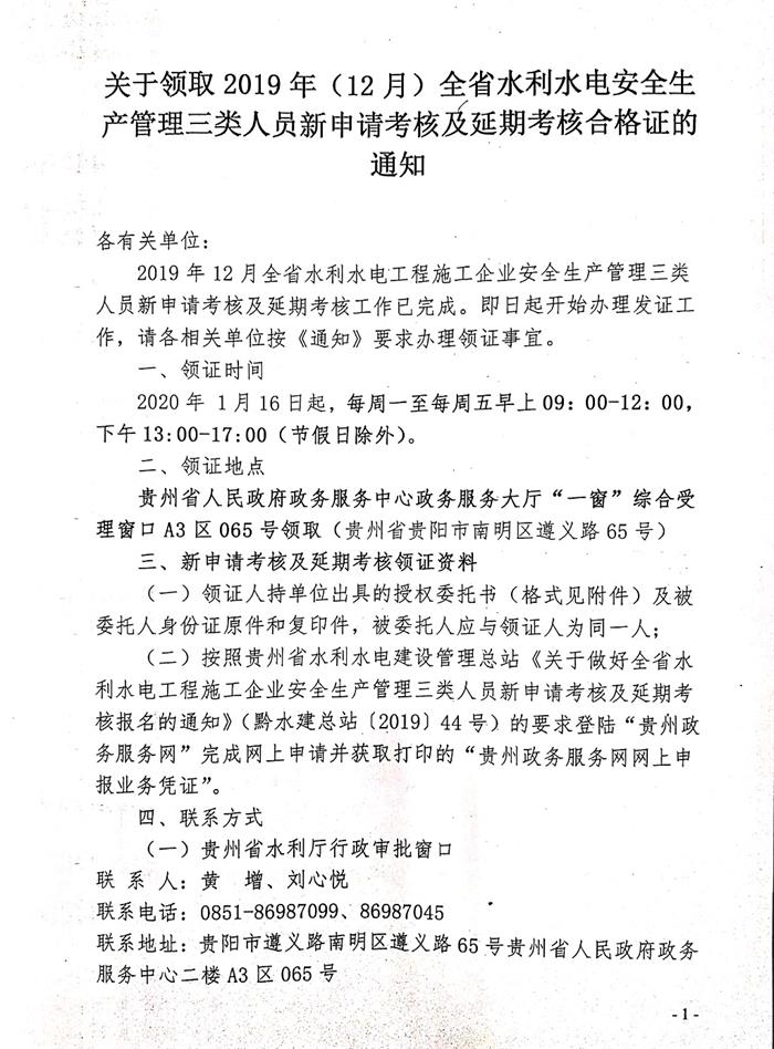 轉(zhuǎn)發(fā)關(guān)于領(lǐng)取2019年(12月)全省水利水電安全生產(chǎn)管理三類人員新申請考核及延期考核合格證的通知