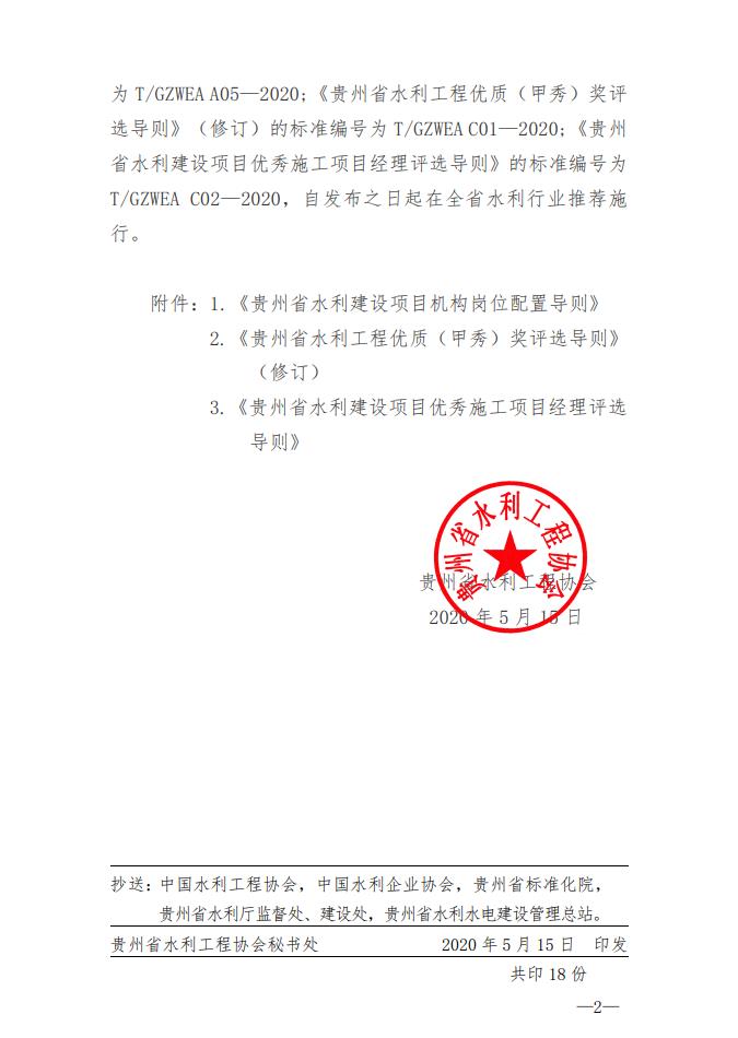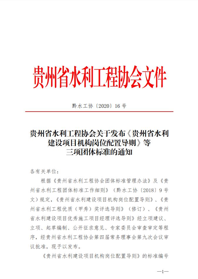 貴州省水利工程協(xié)會(huì)關(guān)于發(fā)布《貴州省水利建設(shè)項(xiàng)目機(jī)構(gòu)崗位配置導(dǎo)則》等三項(xiàng)團(tuán)體標(biāo)準(zhǔn)的通知