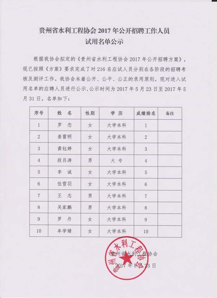 貴州省水利工程協(xié)會2017年公開招聘工作人員試用名單公示