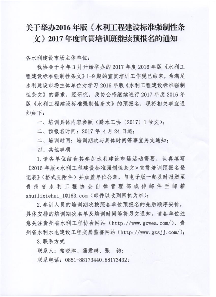 關(guān)于舉辦2016年版《水利工程建設(shè)標準強制性條文》2017年度宣貫培訓班繼續(xù)預(yù)報名的通知