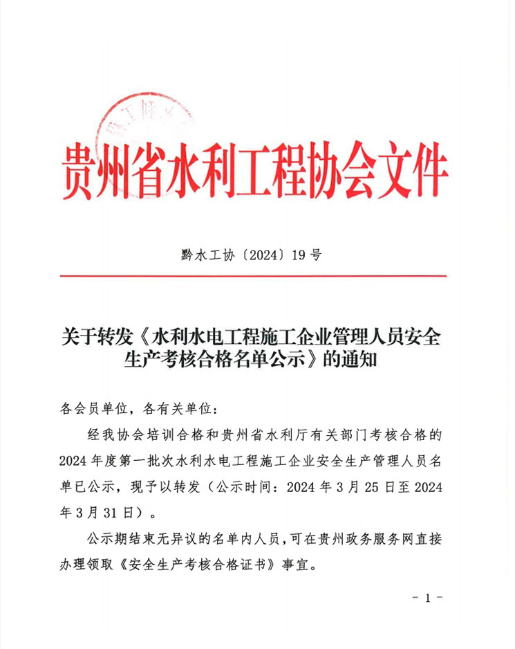 關(guān)于轉(zhuǎn)發(fā)《水利水電工程施工企業(yè)管理人員安全生產(chǎn)考核合格名單公示》的通知