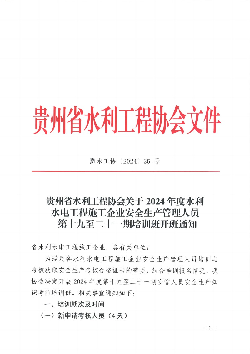 關(guān)于2024年度水利水電工程施工企業(yè)安全生產(chǎn)管理人員第十九至二十一期培訓班開班通知