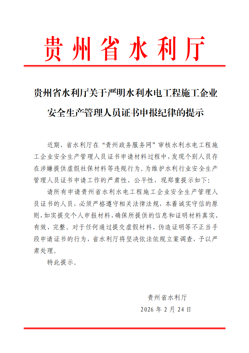 轉(zhuǎn)發(fā)《貴州省水利廳關于嚴明水利水電工程施工企業(yè)安全生產(chǎn)管理人員證書申報紀律的提示》