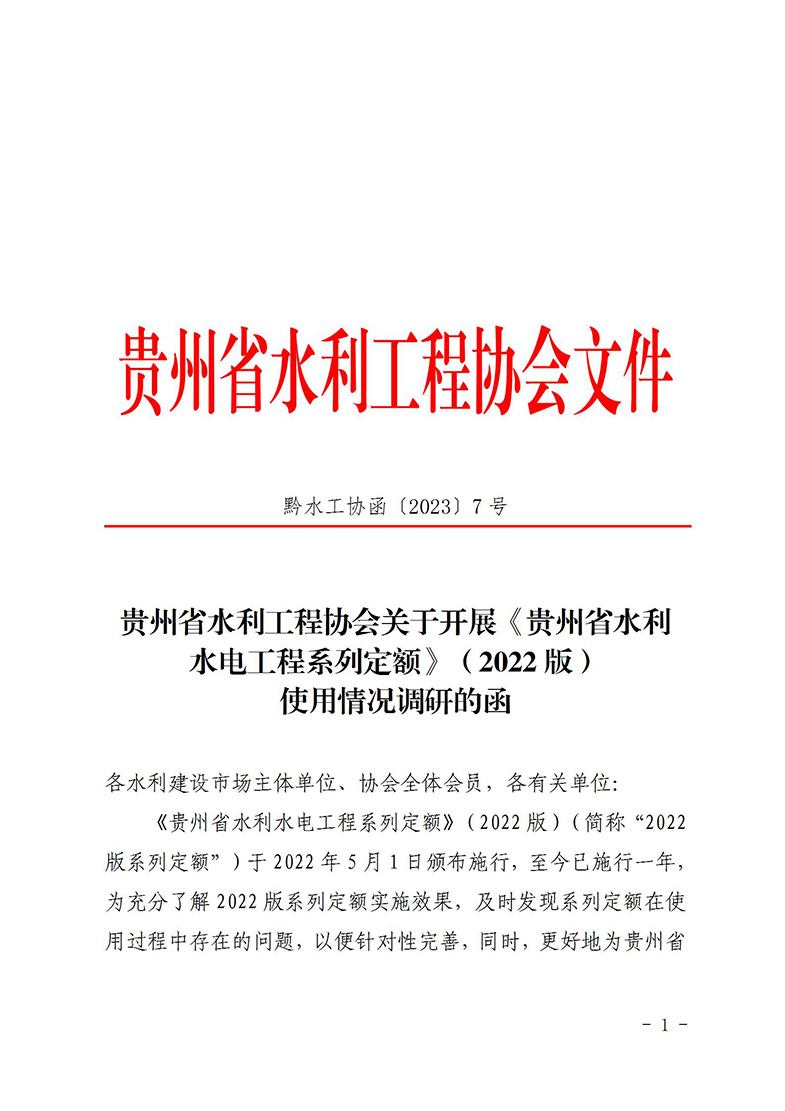 關于開展《貴州省水利水電工程系列定額》(2022版)使用情況調(diào)研的函