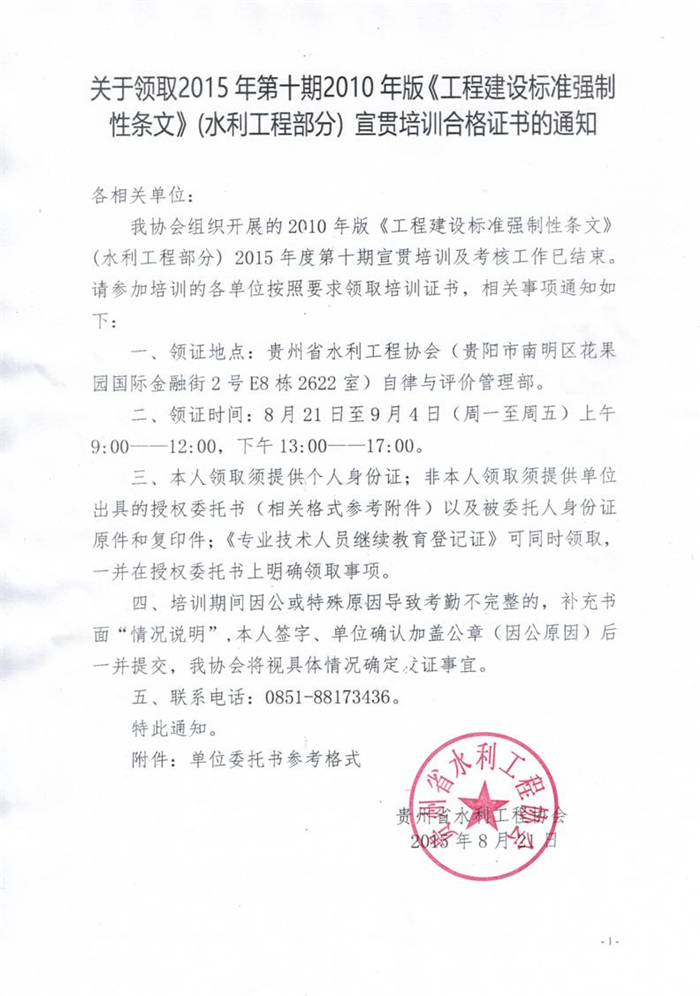 關(guān)于領(lǐng)取2015年第十期2010年版《工程建設(shè)標(biāo)準(zhǔn)強(qiáng)制性條文》(水利工程部分) 宣貫培訓(xùn)合格證書(shū)的通知