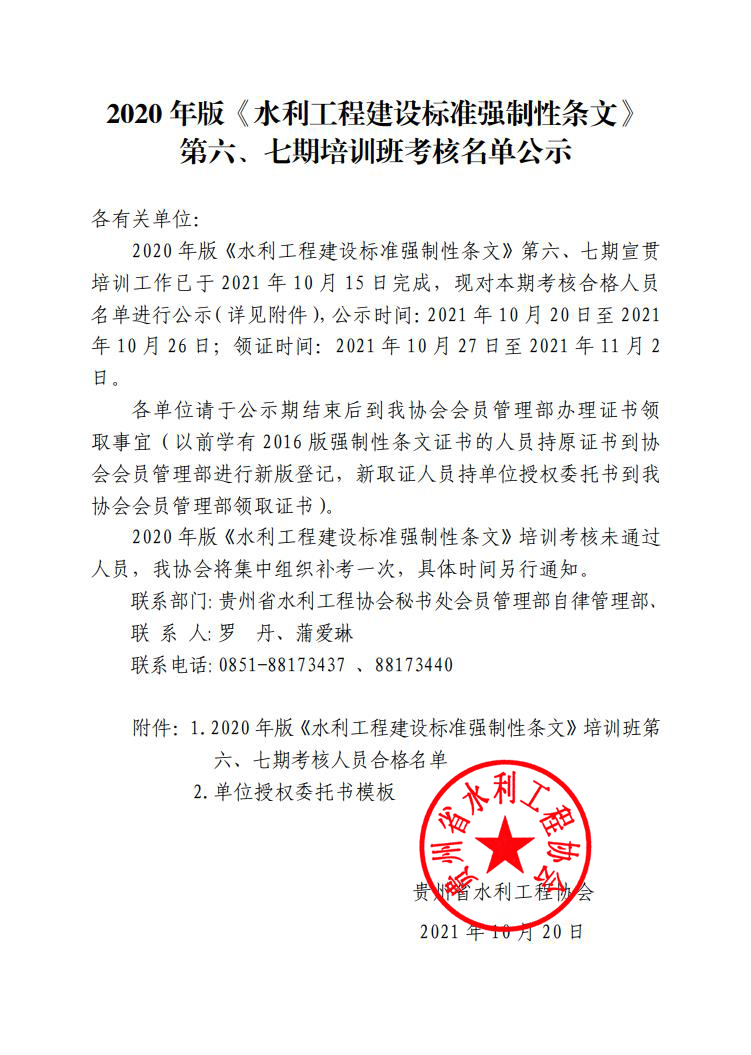 2020年版《水利工程建設標準強制性條文》第六、七期培訓班考核名單公示