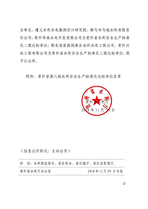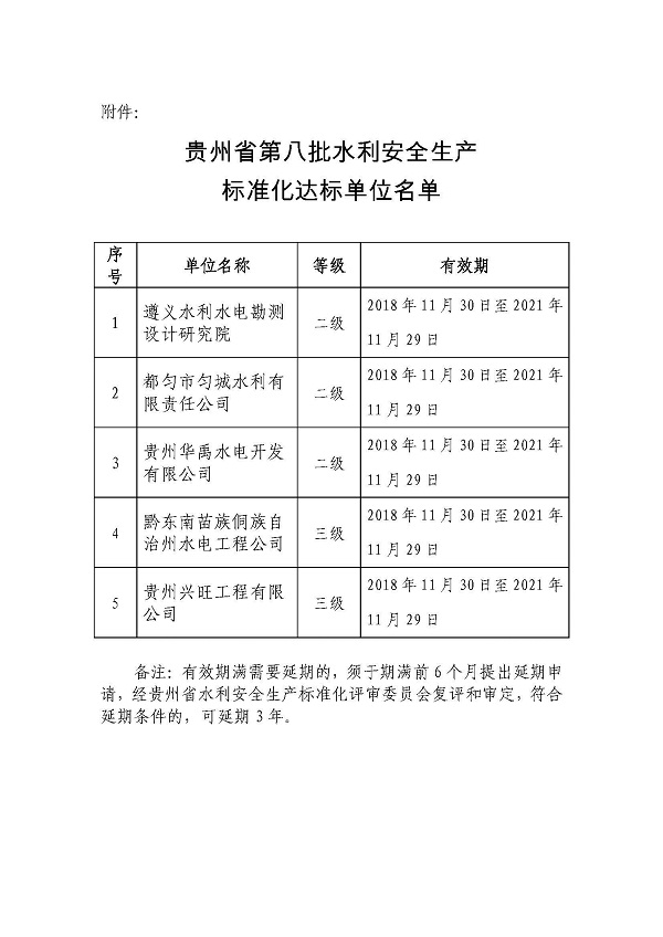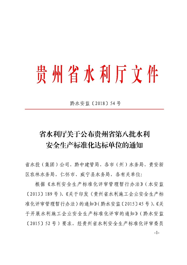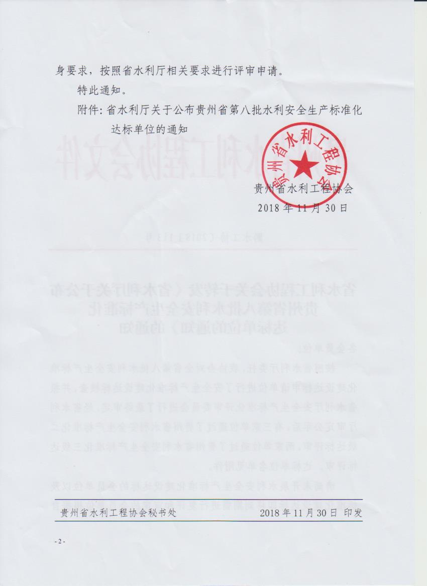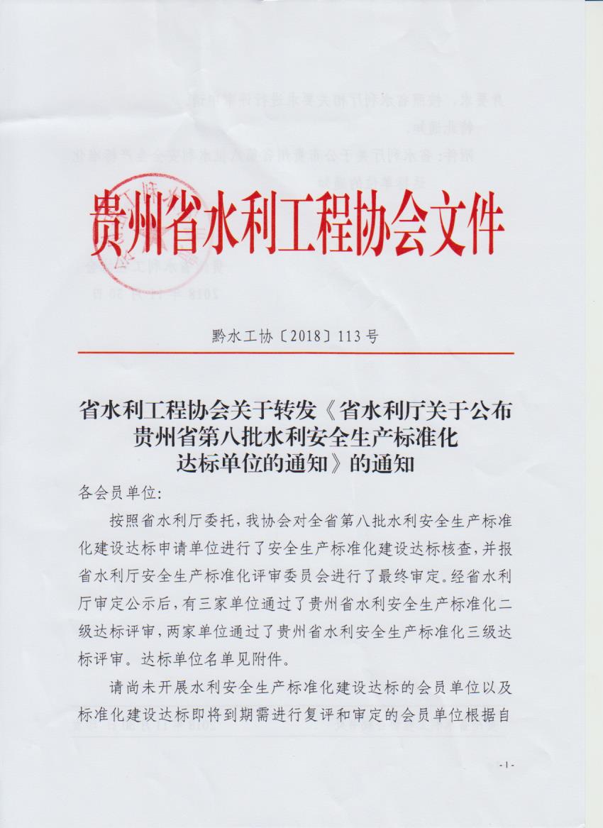 省水利工程協(xié)會關(guān)于轉(zhuǎn)發(fā)《省水利廳關(guān)于公布貴州省第八批水利安全生產(chǎn)標(biāo)準(zhǔn)化達(dá)標(biāo)單位的通知》的通知