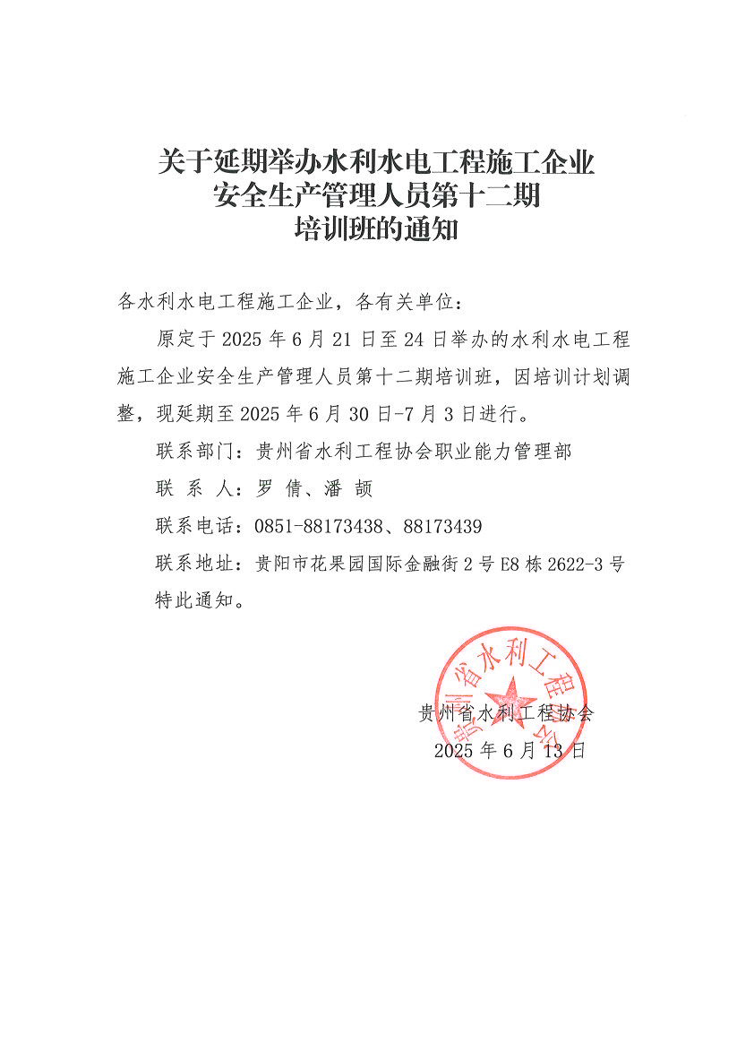 關(guān)于延期舉辦水利水電工程施工企業(yè)安全生產(chǎn)管理人員第十二期培訓(xùn)班的通知