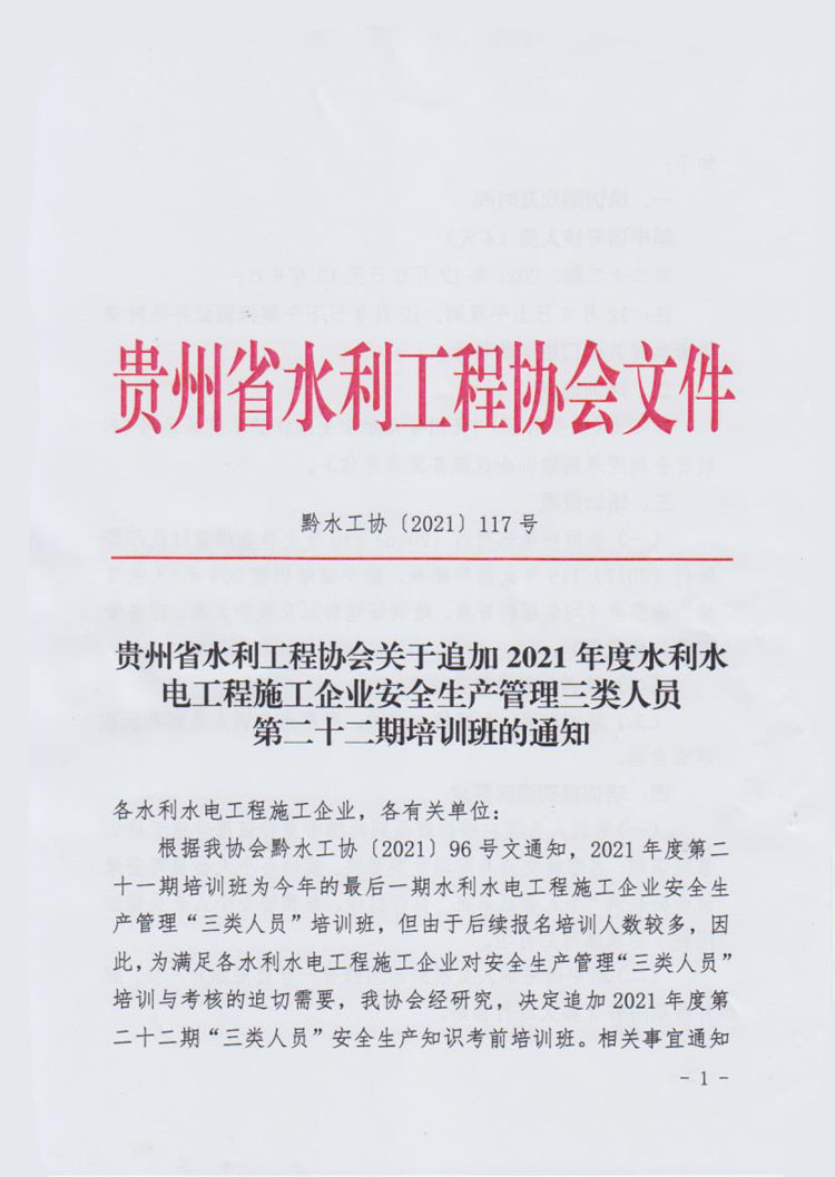 關(guān)于追加2021年度水利水電工程施工企業(yè)安全生產(chǎn)管理三類人員第二十二期培訓(xùn)班的通知