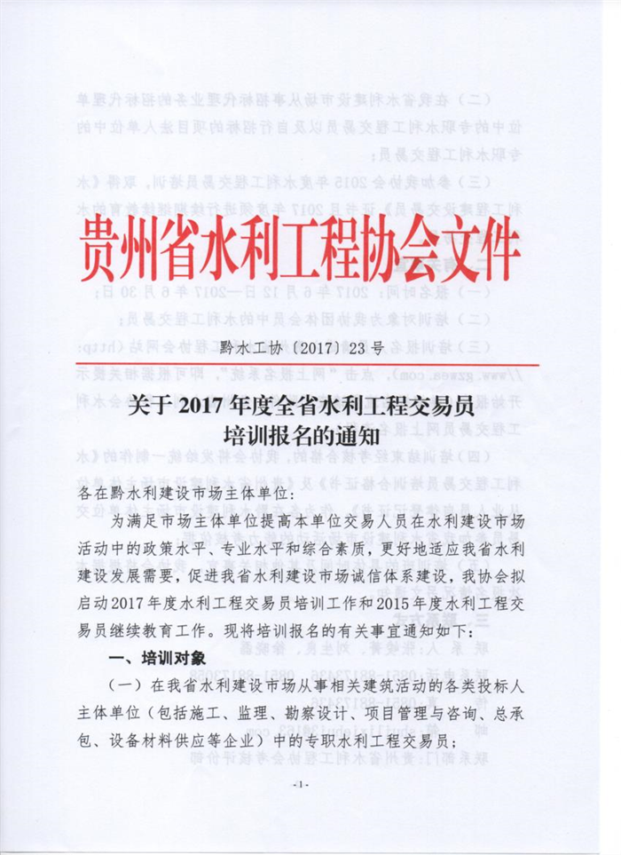 關(guān)于2017年度全省水利工程交易員培訓(xùn)報名的通知