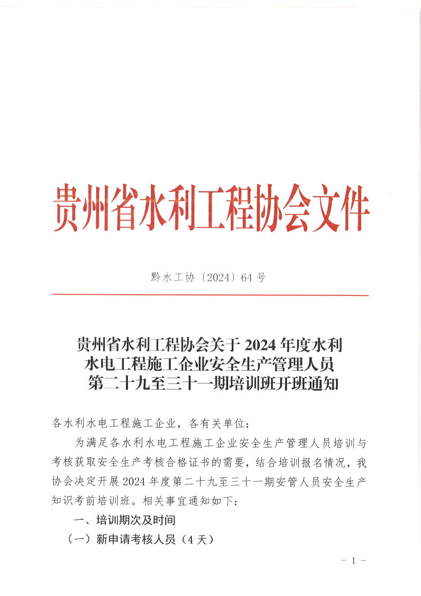 關(guān)于2024年度水利水電工程施工企業(yè)安全生產(chǎn)管理人員第二十九至三十一期培訓(xùn)班開班通知