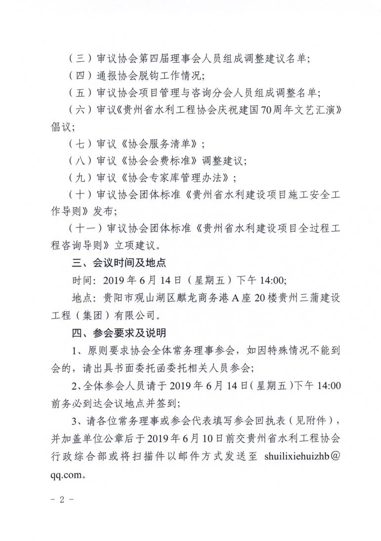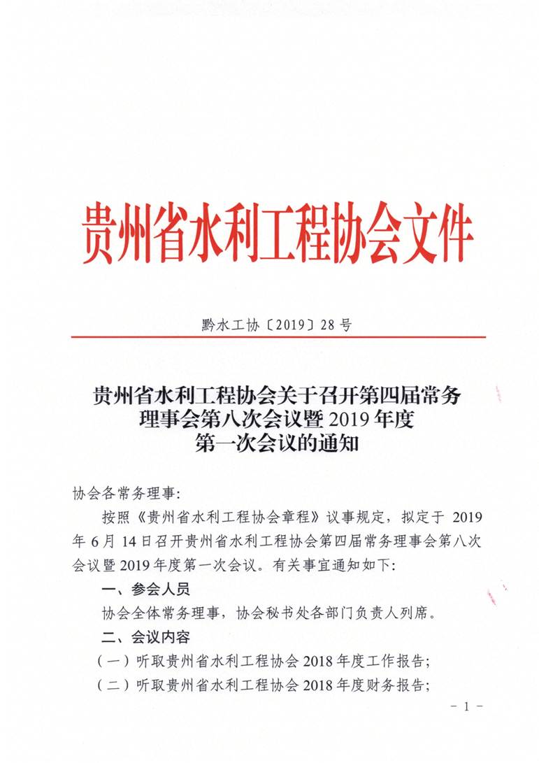 貴州省水利工程協(xié)會關(guān)于召開第四屆常務(wù)理事會第八次會議暨2019年度第一次會議的通知