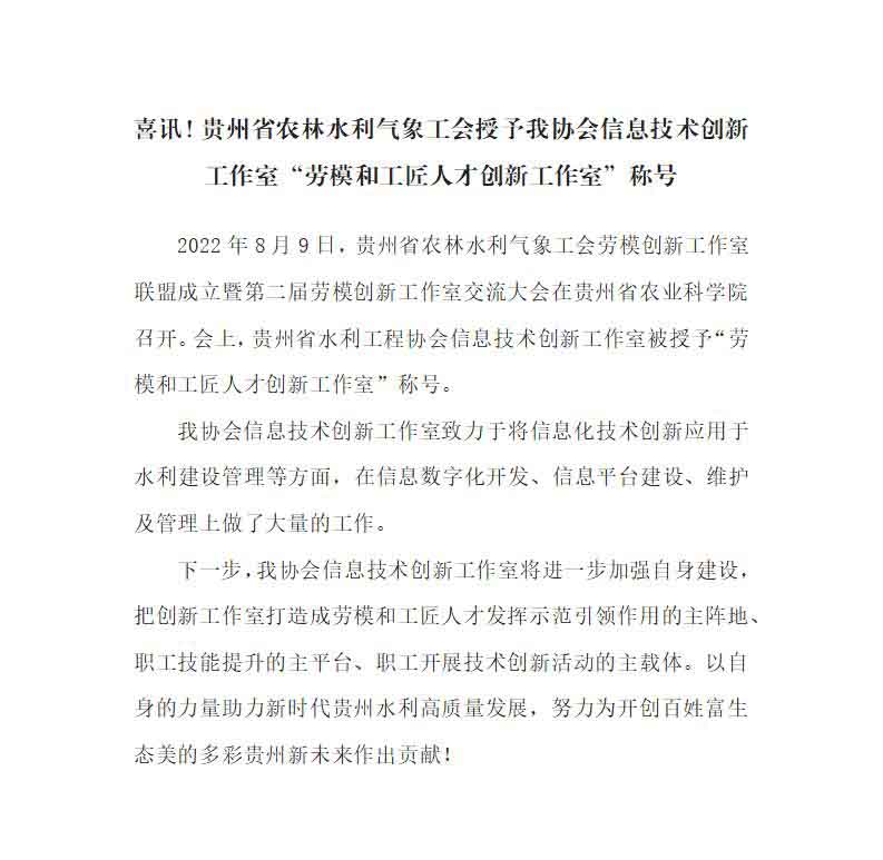 喜訊!貴州省農(nóng)林水利氣象工會(huì)授予我協(xié)會(huì)信息技術(shù)創(chuàng)新工作室“勞模和工匠人才創(chuàng)新工作室”稱號(hào)