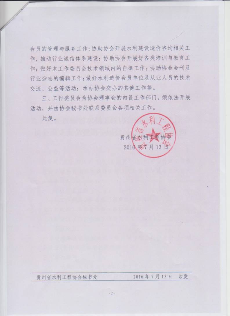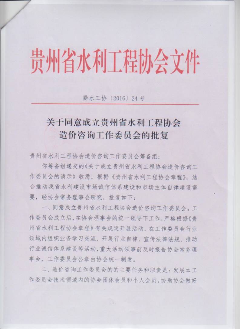 關(guān)于同意成立貴州省水利工程協(xié)會造價咨詢工作委員會的批復(fù)